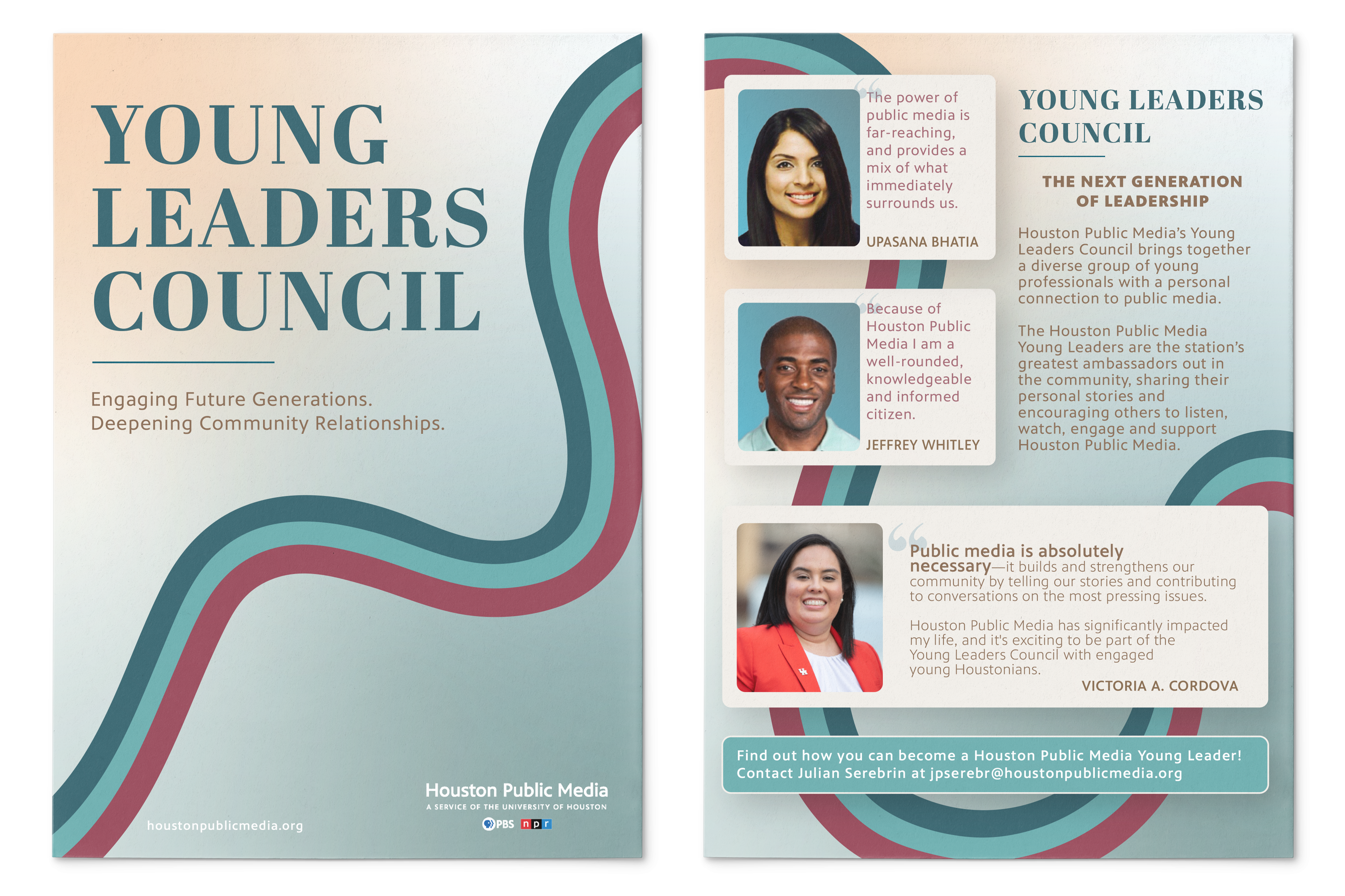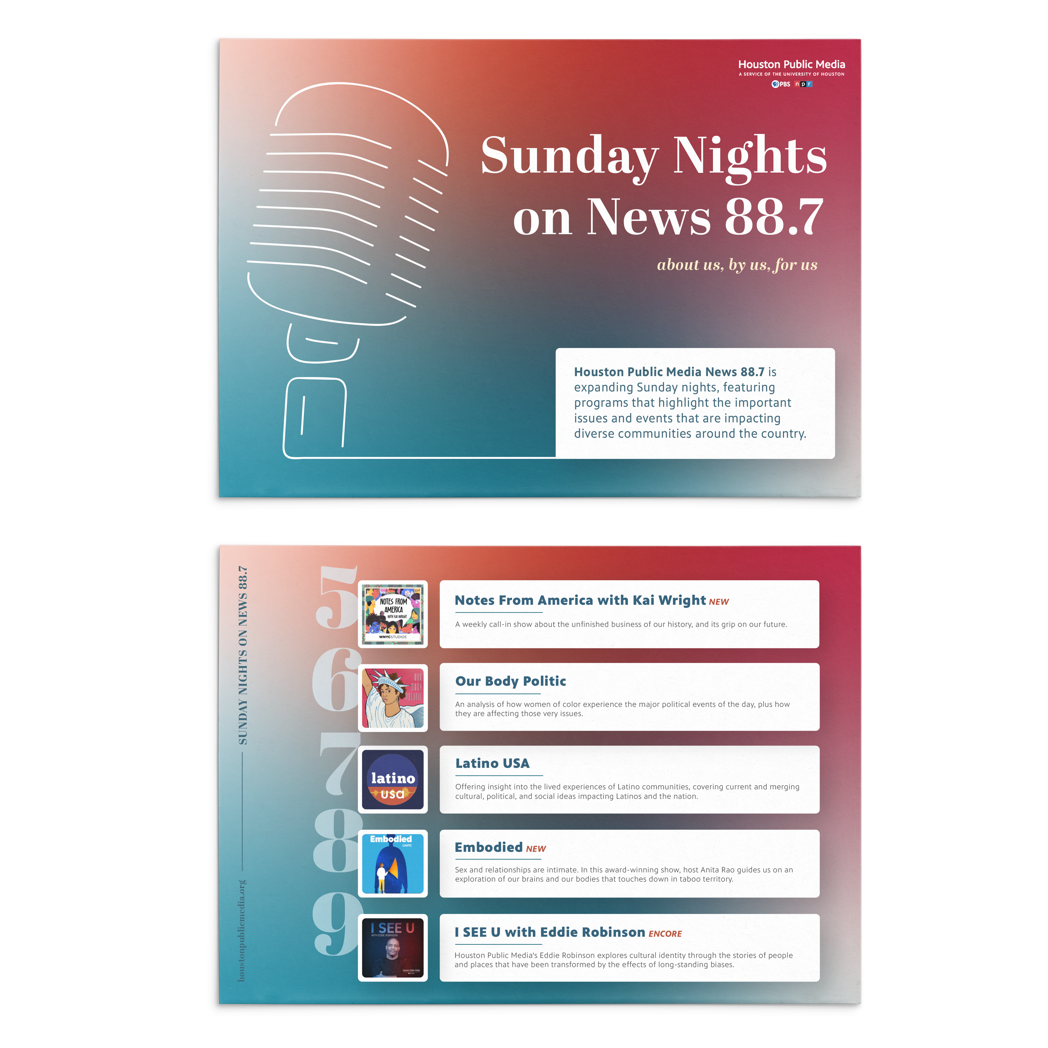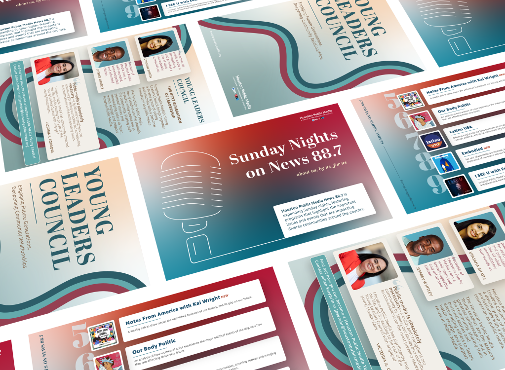 I was tasked with creating two post cards to provide information on the new scheduling lineup for Sunday nights on News 88.7 as well as the Young Leaders Council at Houston Public Media. The intent behind these designs are not only to inform, but to draw in the reader as well, piquing their interest enough to learn more about the subject matter.